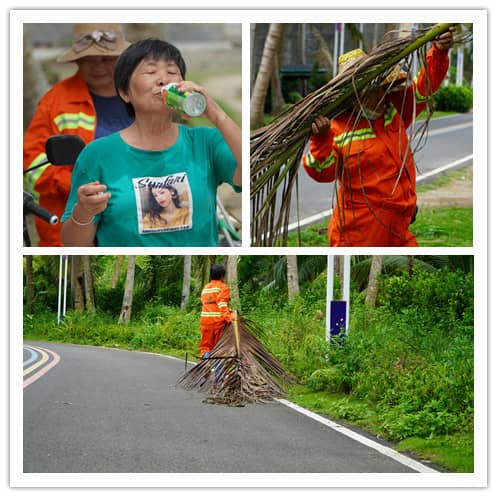 5月的海南,萬物萌發(fā),綠意盎然,平均氣溫26℃-32℃,雖此時(shí)還是清晨,但高溫加上濕熱,華宇暢環(huán)衛(wèi)文城項(xiàng)目部南海村委會(huì)環(huán)衛(wèi)工人的制服早已被汗水浸濕,她們有的在清掃街道、清理椰子樹枯干,有的正在對(duì)垃圾進(jìn)行提前分類,以便清運(yùn)組的伙伴到來快速將垃圾清運(yùn)完畢。